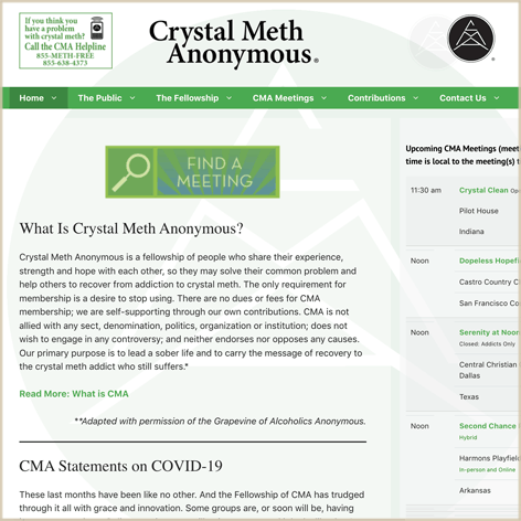 Includes basic information on the CMA 12-step fellowship, the 12 Traditions, CMA meeting schedules, a 24 hour helpline at 855-638-4373, a blog and speaker recordings.