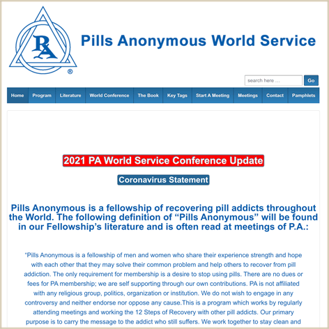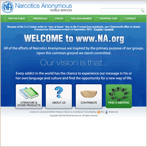 A 12-step program for people addicted to drugs, based on the AA model. The site provides basic information on the program and NA literature. Use Find a Meeting and Local Helplines and Websites to locate NA meetings in the US and 35 countries worldwide.
