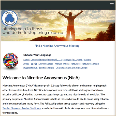 This fellowship offers group support for nicotine recovery using the 12 Steps adapted from AA. Their web site has a Find a Meeting locator by state or country for in-person, phone, or online meetings, email and pen pals. NicA publications are available in 17 languages on the site.