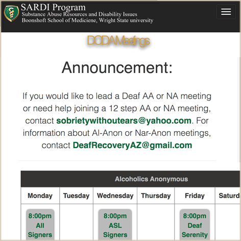 Links to deaf and hard of hearing online AA, NA and Al-Anon meetings.