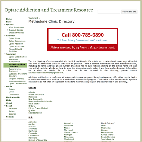 A directory of methadone clinics in the U.S. and Canada. Methadone clinics are organized by state, province and accessible by map. Contact information is provided for each methadone clinic along with a link to their website, if available.