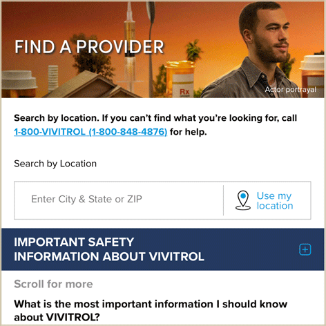 Vivitrol is an injectable medicine prescribed by a doctor to treat alcohol dependence after you have stopped drinking and to prevent opioid use relapse after detox. Use the Provider Locator tool to find healthcare professionals in your area who can discuss VIVITROL.