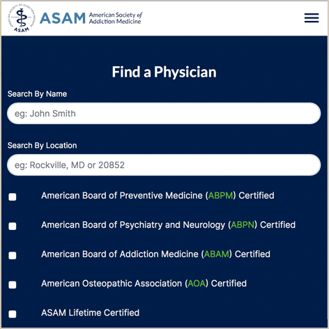 Under Find a Physician, type in a doctor’s name or search by city, state or zip code to find an addiction specialist.