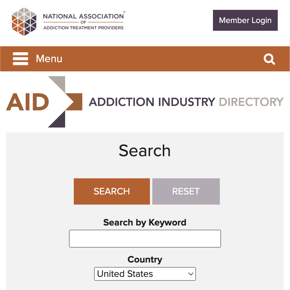 The NAATP Addiction Industry Directory (AID) serves members and the public as a comprehensive source of addiction service providers and supporters. Search by state, type of treatment, specialty, recovery support services, types of payment assistance and payment options, and more.
