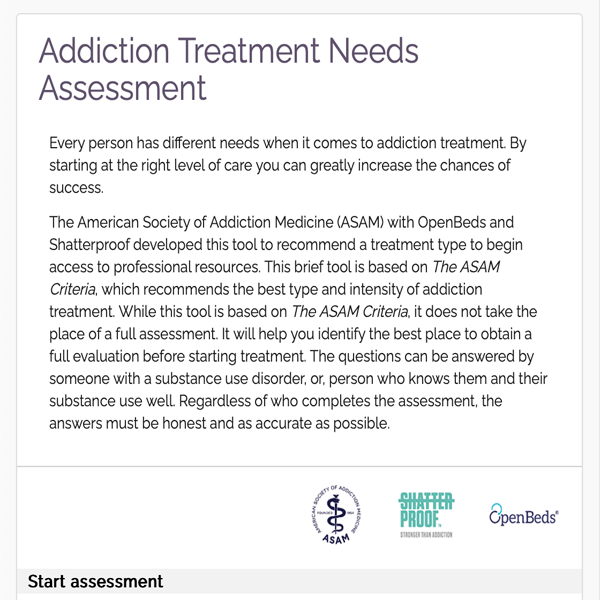Every person has different needs when it comes to addiction treatment. By starting at the right level of care you can greatly increase the chance of success. This tool recommends the best type and intensity of addiction treatment to begin your recovery – and will help you identify the best place to get a full evaluation before starting treatment. The questions in this assessment tool can be answered by someone with a substance use disorder, or a person who knows them and their substance use well.